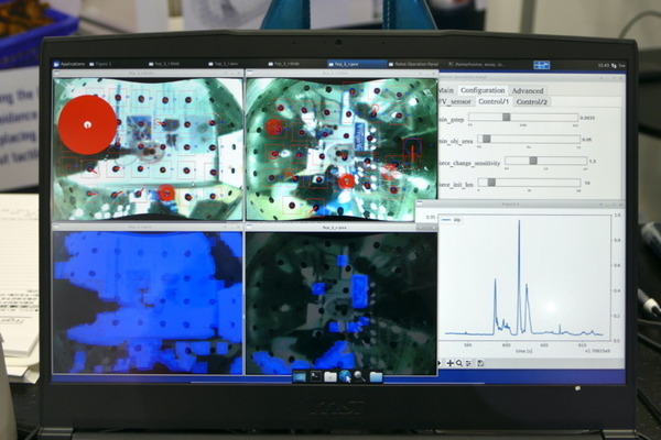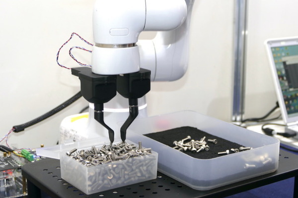 この近接覚センサーと、素材ごとに異なる反射率を学習させた軽量のAIモデルを組み合わせることにより、距離と角度を検出し、ロボット制御に返す。ガラスや鏡など従来のロボットピッキングが苦手なものも扱えることができ、プログラミングコストも低減できる。「いわば反射神経的に少ない演算量でつかめている。中央のコントローラーの演算量を減らすことができる」という。