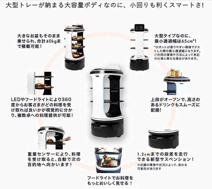 「Servi Plus」は大型配膳ロボットで、業界トップクラスのナビゲーションで最小65cm(※1)の道幅でも通ることができる。大容量でありながらも小回りが利くため、通路幅の狭い店舗でも柔軟に走行が可能。(「Servi」は最小60cmの道幅対応)