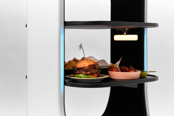 「Servi Plus」は、最大積載重量40kgで複数卓への配膳も可能(「Servi」は合計最大30kg)。4段トレイに角盆などもそのまま載せることができ、一度にたくさんの料理を運搬できる。また、上段がオープンになっており、高さのあるドリンクや料理もスムーズに配膳でき、お客さまの幅広いニーズに応じて業務効率の向上を実現する。