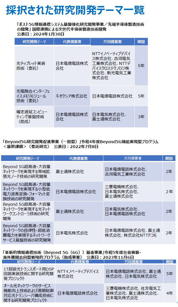 なお、NTTは従前より国立研究開発法人情報通信研究機構(NICT)の「Beyond5G 研究開発促進事業」と「革新的情報通信技術(Beyond 5G / 6G)基金事業」にも参画しており、今回の採択によって、ネットワークと先端半導体双方の研究開発プログラムに採択されたことになる。その背景もあって、今回の説明会ではIOWNのコンピュータ構想とネットワーク構想の両面で詳しい解説が行われた。