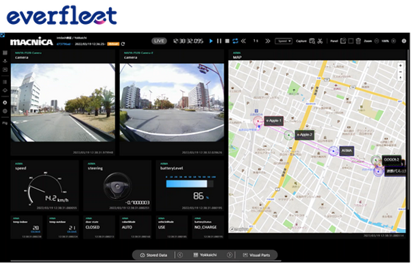 everfleet(エバーフリート)ではモビリティの位置情報や車内外のカメラ映像に加え、車速・ステアリング・バッテリー残量などの車両データを統合して一元的に可視化し、信号機などの交通インフラと協調した外部データとの連携も可能となっている。これにより、運行状況を遠隔地からリアルタイムに把握し、安全・安心に自動運転モビリティを運用することができるようになる。さらに、複数地域の多種多様なモビリティを同時に群管理することや運行時の異常をシステムによって自動的に検出・通知することができるため、1人の遠隔オペレータによって、効率よく自動運転モビリティを運行管理することで、オペレーションの省人化を実現し、交通採算性の改善にも貢献する。