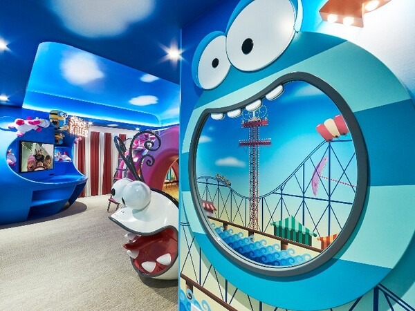 壁面には遊園地の風景、天井には青空が広がり、作中に登場するクリーチャー型のジェットコースターやゲーム「スペース・キラー」を模した家具、インテリアを配している。これらはすべてユニバーサル・スタジオ・ジャパンのオブジェを手掛けている工房にて制作。ミニオン・パークさながらに映画の世界観を体験できる。