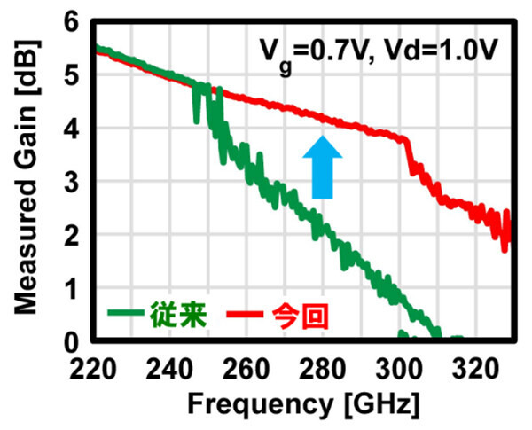 その結果、レイアウト最適化による寄生抵抗・容量の低減により、250-300GHz帯での利得が従来に比べて大きく向上した。