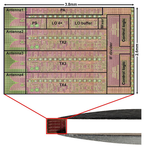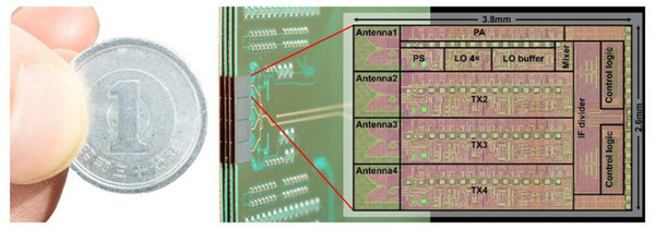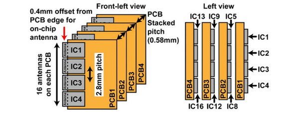 このチップのアンテナ部は、イオン照射により基板を高抵抗化することで、損失を低減している。この4系統の送信回路を有するCMOS ICチップをプリント基板上に4つ並べて実装することで、16アレイのフェーズドアレイ送信機を構成した。