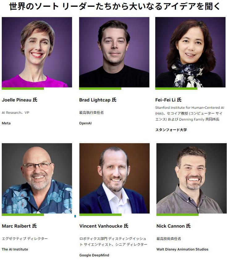 AIやロボティクス、グラフィクス、医療など、様々な分野からこれほど著名な研究者が集まるイベントはそうそうない。特にロボスタ読者にお勧めしたいのは、スタンフォード大学のFei-Fei Li博士や、OpenAIのBrad Lightcap氏はもちろんのこと、ボストンダイナミクスの講演でお馴染みのMarc Raibert 氏(The AI Institute)、Google DeepMindのVincent Vanhoucke氏の講演もチェックしておきたい。特にGoogle DeepMindはロボティクス部門の担当者なので、ロボット関連の興味深い話が聞けそうだ。