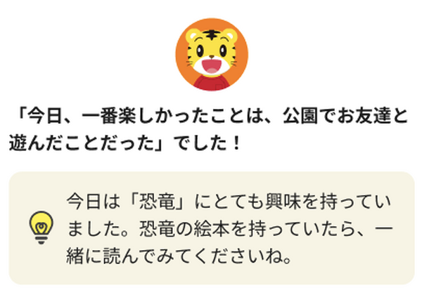 しまじろうとの「おしゃべり」や「あそび」の中で見えた「興味」や「感情」をAIが分析し、専用サイトでレポートを表示。お子さんの成長が見えることに加え、気づかなかった興味や好きを発見し、伸ばしてあげることをサポートが可能となっている。