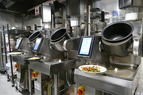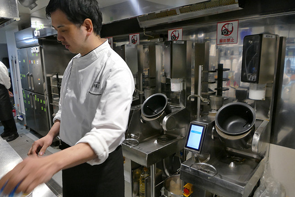 実際に調理している様子を見せてもらった。厨房には3台の調理ロボットが設置されていた。3人分の炒め作業が一人でできる。単純計算で二人減らせている計算だ。