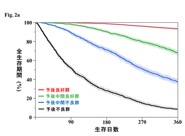 また、AIにて患者の期間内における生存確率を予測させ、その予測された生存確率によって患者を4グループに分類したところ、AIの予測通り、予後が良好群、中間良好群、中間不良群、不良群の4つに大きく分かれることが示された(下図)。