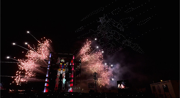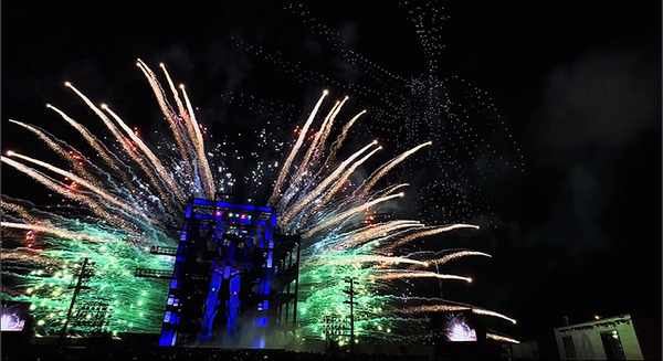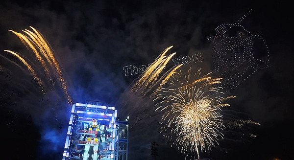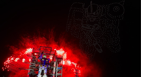 更に、YOASOBIの「機動戦士ガンダム 水星の魔女」や劇場公開中の「機動戦士ガンダムSEED FREEDOM」の音楽に合わせてドローンがそれぞれのガンダムを夜空に浮かび上がらせ、豪快な花火が上がって、集まった多くの観客たちが゜歓声をあげた。