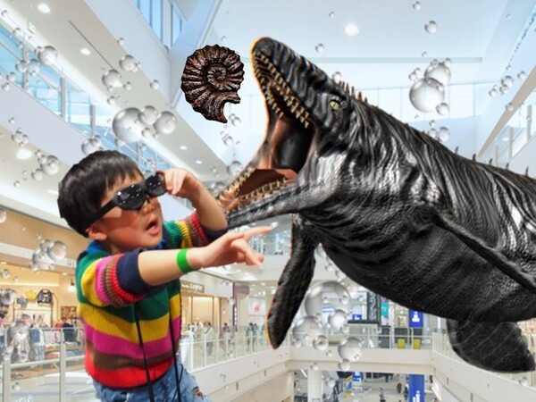 今話題の最先端デバイスであるARグラスをかけると、目の前の世界にARコンテンツが登場。海の覇王とも呼ばれる恐竜・モササウルスの迫力を等身大スケールで体験できる。手のアクションに反応して、名前を表示したり、近寄ってきたりと楽しめる。