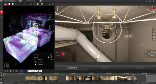 さらに、ELIOS 3に搭載しているLiDARにより、屋内でのドローンによる撮影位置の特定が可能になり、地下ピットだけでなく、ホールや劇場の天井など、足場を使わないと点検できなかった高所などの危険な箇所での点検作業や、改修工事前の足場計画にも有効であると評価された。