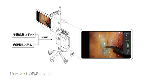 「Eureka α」は、手術用の内視鏡システムや手術支援ロボットから受けた映像信号を解析し、術者が通常確認するモニターとは異なるサブモニター上に疎性結合組織とよばれる線維性の構造物を強調表示することで外科医の視覚認識を支援する。胃、大腸、鼠径ヘルニア領域の手術において使用することが可能。あくまで構造物の認識を支援とすることを目的としており、手術操作の判断は外科医が行う。