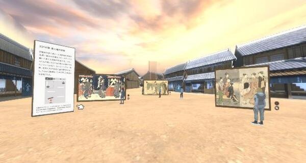 評判の町娘や名高い遊女を描いた美人画を江戸の町並みを再現したメタバース空間上で展示。江戸の町民になった気持ちで、美人画を眺めながら町を闊歩するような体験を提供する。