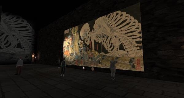 妖怪や異形のものたちの姿が生き生きと跳ね回る様子が描かれた三枚続の浮世絵を、怪談の舞台にもなりそうなメタバース空間に展示する。薄明りをたどりながらアバターで前に進むと、暗闇に浮かぶ作品を鑑賞できる。