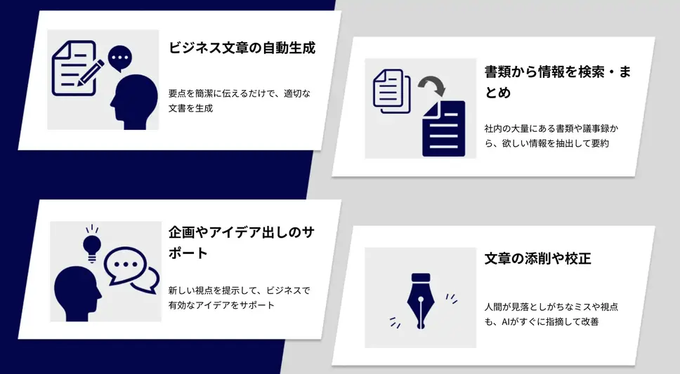 ビジネス環境に最適化されたAIアシスタントで、文章作成に関わる作業時間を削減し、より戦略的な業務に注力できるようになる。