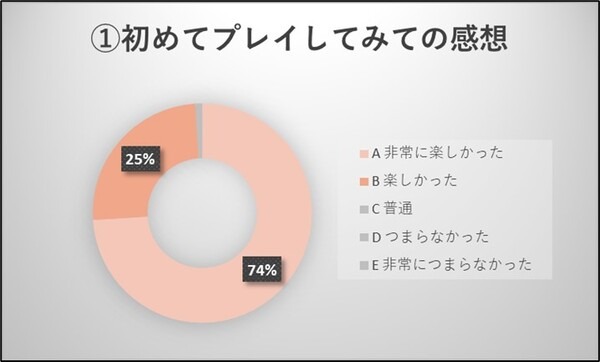 初めてプレイしてみての満足度(「非常に楽しかった」及び「楽しかった」の回答)は99%と高い評価を得られた。