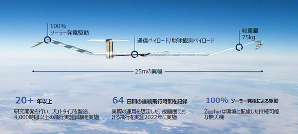 機体は幅25m、重量75kgと、HAPSとしては比較的小型だ(ソフトバンクが開発しているHAPS「Sunglider」の約1/3のサイズ)。その分、ペイロードも小さく、搭載できる通信機器はリピーター(中継機器)や小型の地球観測機器に限られる。とはいえ、既に連続64日間の飛行実績を2022年に達成し、信頼性も高い。