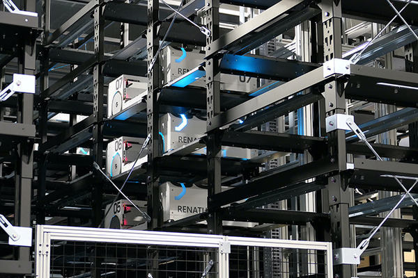「RENATUS」はいわゆるGTP(Good-to-Person)方式のシャトル型自動倉庫。2023年の「国際ロボット展」で西部電機ブースで紹介されていたものだ。