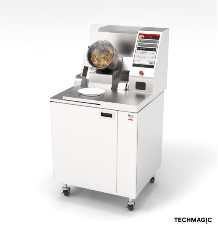 TECHMAGICが開発した調理ロボットI-Roboは、攪拌、加熱、調理後のフライパンの洗浄といった一連の動作を自動化することができるロボットで、炒飯・野菜炒めなど、熟練の職人のレシピを自動で再現する。自動調理においては、メニューに応じて、加熱温度、加熱時間、フライパンの回転スピード、回転方向を柔軟且つ適切に調整できる。このように、I-Robo の導入により、人手不足の課題に対し省人化を推進し、解決を目指す。