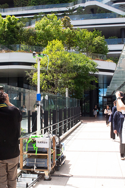 今回の実証実験と報道陣向けデモは、ソフトバンクの本社ビル付近の道路上で実施した。送信側は、地上約10mの高さにある歩行者用デッキ(歩道橋)に、新開発の「コセカントアンテナ」(後述)を取り付けた基地局相当の無線機を設置してテラヘルツ電波を送信する(実際には、5Gの変調信号を300GHzに変換して送信)。