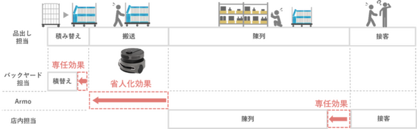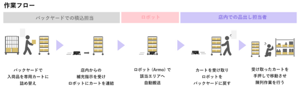 「Armo」を活用したオペレーションでは、店舗内で行われる品出しなどの搬送作業は自動化される。さらに、バックヤードでの商品の積み替え作業や店内での陳列作業はスタッフがそれに専任化することで、習熟も早くなり生産性も向上する、としている。(下図:作業フロー参照)