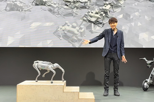 千葉工業大学の古田貴之氏が披露したデモは、四足歩行ロボットを使った衝撃的なもの。デジタル空間上で4,096台のロボットを使ってAIをトレーニングし、2万世代進化させた次世代AIへとステップアップ。その結果、カメラもLiDARも使わずに手探り足探りで階段を登る多脚ロボットのデモができるようになった。高度に進化したAIにロボティクスの身体性を与えた場合の驚異的な進化の状況を紹介した。古田氏は「これからは進化したAIにどのようなボディを与えるかという思考の変化が重要、今日この日は時代の転換期を目撃している」と語った。