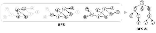 ・BFS木構築:与えられた始点に基づき、木でない部分においてのみ従来通りのBFSを実行する。それにより得た部分的なBFS木に、事前計算で分解しておいた木をコピーして接合することで完全なBFS木を得る。与えられた始点が木の集合と木でない部分のどちらに含まれるかにより場合分けされ、始点の選び方に関係なく正しいBFS木が構築される。