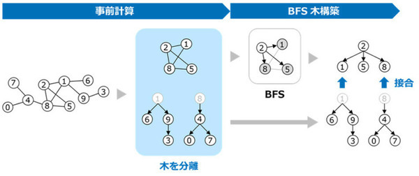NTTはグラフ(頂点と枝により事物の関連性を示したデータ)に対して、頂点全体のつながりを始点から近い順に辿る計算(BFS)を高速に行うためのアルゴリズム「Forest Pruning」を開発した。