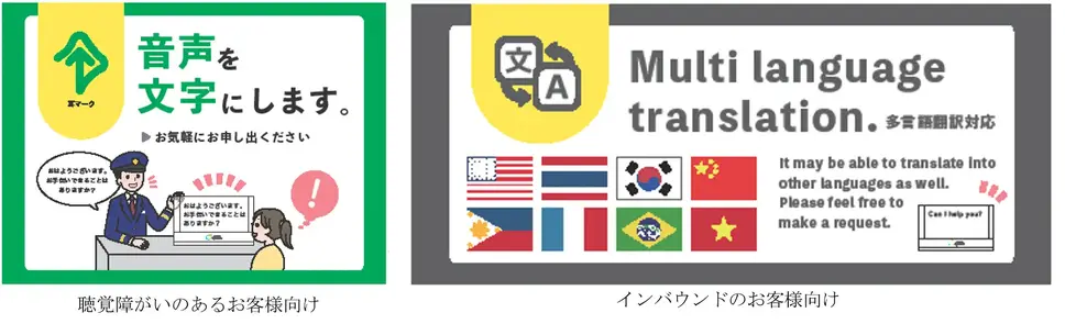 今回実証実験を行うシステムは23か国の言語に対応しており、AIを活用して会話をリアルタイムで翻訳し、透明ディスプレイに表示することができる。この機能により、インバウンドの旅行客や聴覚に障がいのある利用客等へのより円滑な応対が可能となることが期待される。