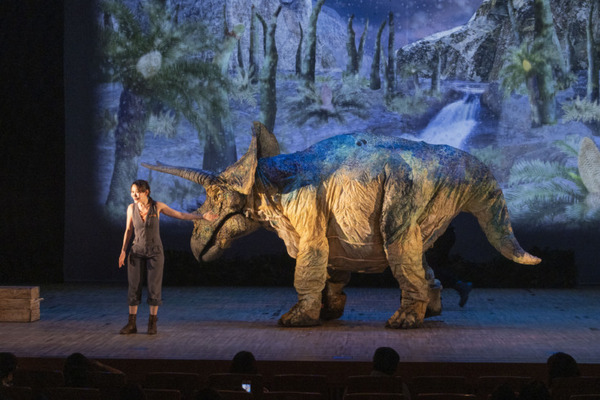 舞台上で恐竜に花をあげる様子