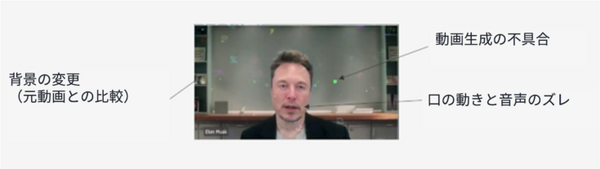 元の素材は、ウォール・ストリート・ジャーナル(WSJ)のインタビュー動画が使用されており、その上から修正が加えられている(背景に注目)。しかし音声クローンについては人間の耳ではほとんど区別ができないレベルに達しているという。