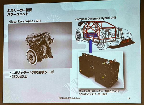 「Rally1」の動力はハイパワーなパワーユニットによって最高出力500PS以上が生み出されています。パワーユニットは、内燃機関(エンジン)とモーターのハイブリッドで構成されています(最高出力500PS以上はエンジンとモーターの合計)。