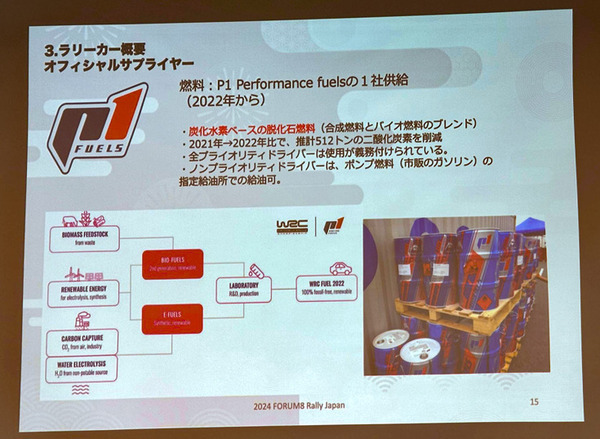 WRCでは2022年のFIA Rally1技術規則から定められています。モータースポーツの最高峰に位置するFIA世界選手権はいろいろなカテゴリーのレースや大会がありますが、100%持続可能な非化石燃料が使用されるようになったのは、当時、WRCのRally1が初ということです。