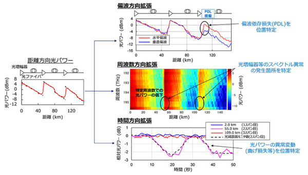 DLM技術により可能となった、光ファイバ伝送路中の距離方向に分布する光信号パワーの測定に加え、偏波、周波数、時間方向にまで拡張した4次元光パワー可視化技術の開発に成功し、これを同フィールド環境下で実証した。この次元拡張技術により、光ファイバ伝送路中の複数の異常を位置特定することが可能となった。