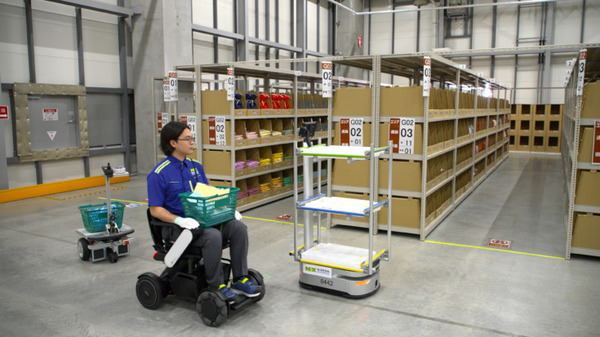 また、「WHILL」とAGV(自動誘導車)、AMR(自律移動ロボット)などの無人搬送機を連携させることで、歩行困難者もピッキング作業などの倉庫内作業を可能とした。