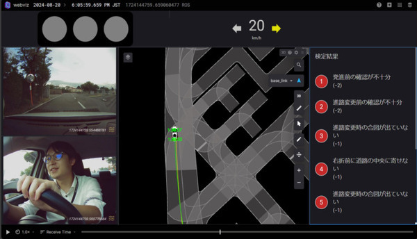 各種センサーを車両に後付けし、自動運転技術の活用によって、自身の車両と、周囲の車両との位置関係や情報を認識し、記録することができる。また、車内にカメラを搭載し、画像解析AIが運転者の目、鼻、耳などの動きから確認行動の有無を把握する。その他、車速や舵角などの走行情報も取得しており、これらのデータから検定時の評価基準に基づいて評価する仕組みとなっている。教習終了後はレポートとして評価内容を確認するほか、動画にて、減点された項目について確認することができる。