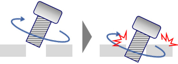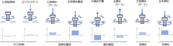 ボルトのネジ山を母材のネジ溝に合わせるため最初に任意で設定した回転回数で逆回転動作を実施。自動化の工程でも、ボルトかじりの発生を抑制する。