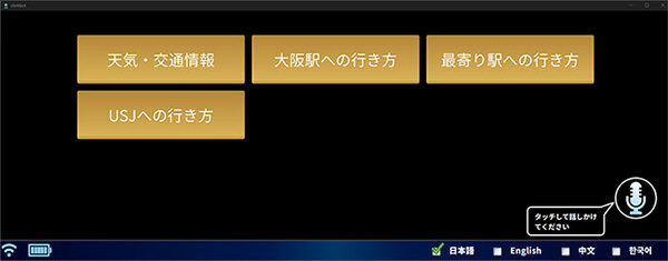 モニター画面をタッチまたは音声入力することで、館内案内書類から人工知能によって適切な回答文章を自動生成し、読み上げ、同時に字幕を表示。カメラで人物を認識すると自動で音声入力モードになり、読み上げると同時にモニター画面に、字幕を表示する。