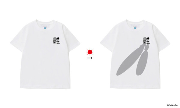 実体がなく、決して捕まえられない〝影〞をその場に留めておける、ドラえもんのひみつ道具「影ぶんちん」がTシャツに。紫外線を当てると色が変わるフォトクロミックの技術によって、太陽光の下に出ると影が濃くなり、室内に入ると5分くらい影が残り、やがて消えていく。