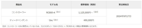 エプソン販売株式会社は、水平多関節を持つ産業用スカラロボットの新商品『GXシリーズ』に対応したコントローラー『RC800-A』、ティーチペンダント『TP4』、「Tシリーズ」「LSシリーズ」「GXシリーズ」の食品製造機械での使用が認められている食品グリス仕様の3モデルを追加し、2024年9月17日より受注開始したことを発表した。