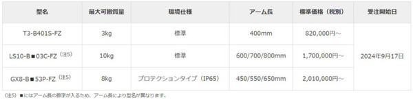 可搬質量やアーム長の異なる3モデル7機種の豊富なラインアップを用意。顧客の工程、扱う食材に合わせて選ぶことができる。