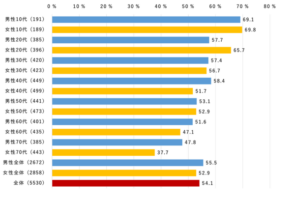 全体では5割強の人が動画を視聴するときに「倍速視聴をすることがある」と回答。性年代別で見ると、10代男女・20代女性は約7割、20代男性・30代男女・40代男性は約6割が「倍速視聴をすることがある」と回答しており、若年層ほど高かったが、シニア層でも4~5割が「倍速視聴をすることがある」と回答している。