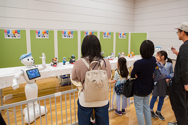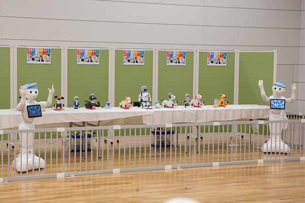 「aibo(アイボ)」、会話ロボット「PALRO(パルロ)」、人型会話ロボット「Pepper(ペッパー)」、見守りロボット「BOCCO emo(ボッコエモ)」、モバイル型会話ロボット「RoBoHoN(ロボホン)」、会話AIロボット「Romi(ロミィ)」が大集合。みんなで息を合わせたダンスを15分に1回披露している。
