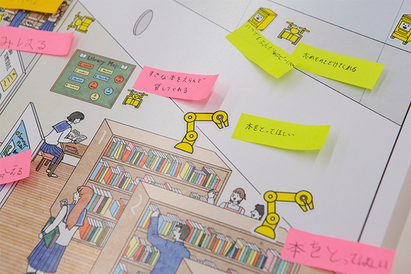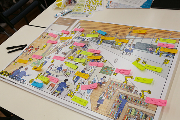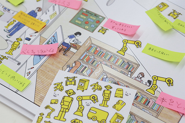 街のイラストが描かれたパネルに、子ども達はロボットのシールを貼って「どこにどんなロボットがいたら便利? 楽しい?」というテーマで付箋紙にアイディアを書いていく。