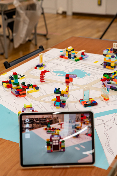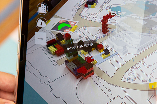 竹芝を舞台にレゴブロックを使って建物・町作りを体験。タブレットのAR画面には、今いる竹芝ポートタワーや3D人流データがARで現れて、活きた街が実感できる(ホロラボ、MetCom)。