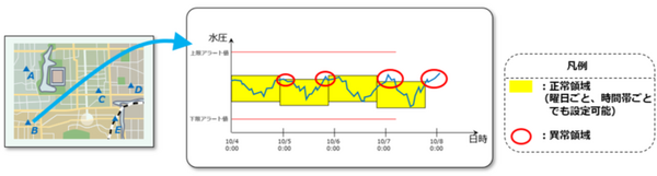 その後、当時の水圧データに対してAI分析を行った結果、故障が確認できた約1カ月前から、毎日0~6時の時間帯において、正常時に対して水圧値が上方に超過していたことが分かった。超過原因は減圧弁内部のネジの緩みなどだった。