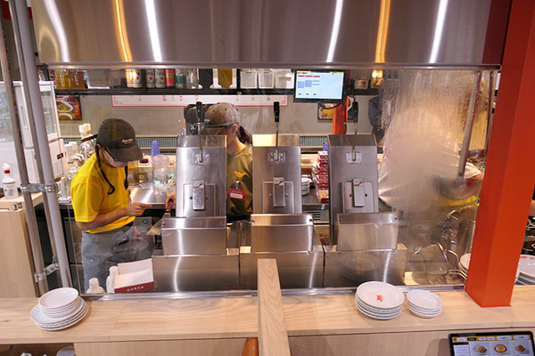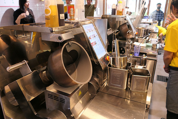 カウンター側や、一番奥のテーブルからは厨房のなかもよく見える。TECHMAGICの炒め調理ロボット「I-Robo2」は2台設置されている。「I-Robo2」は攪拌、加熱、調理後のフライパンの洗浄といった一連の動作を自動化できるロボットだ。天津飯以外の炒めメニューは、ほぼロボットで調理できる。200Vで動作する。