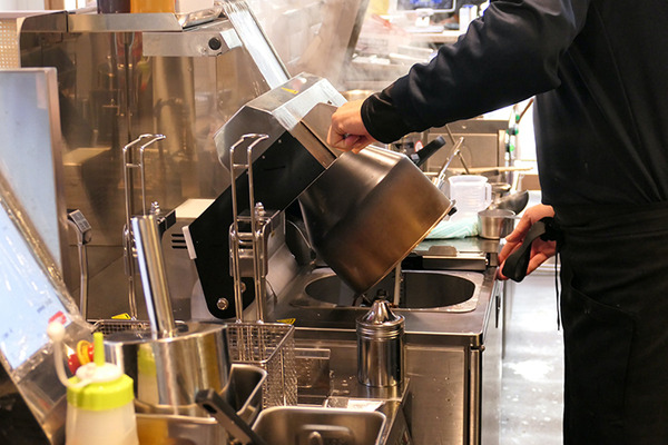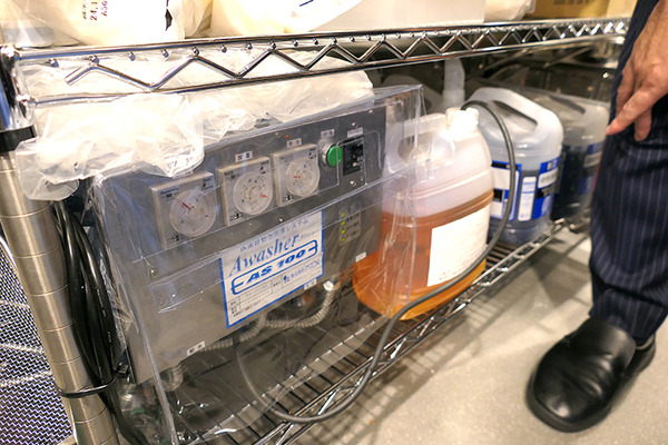 床にも「自動洗浄システム」を採用した。ボタンひとつ押すだけで床全体に洗剤の泡と水が流れる。営業終了後に自動で床を洗浄できる。このような様々な変革を進めることで厨房環境の改善を行い、労働負荷を減らし、人手不足を補う。