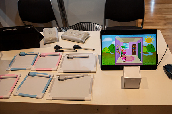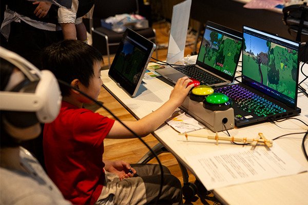 親子で力を合わせてバーチャル世界の冒険に挑戦。この写真、お母さんはVRゴーグルを着けてバーチャルな世界に飛び込み、1人でミッションに挑戦。ただし、お子さんが強力な能力を得て、外からお母さんをサポート。