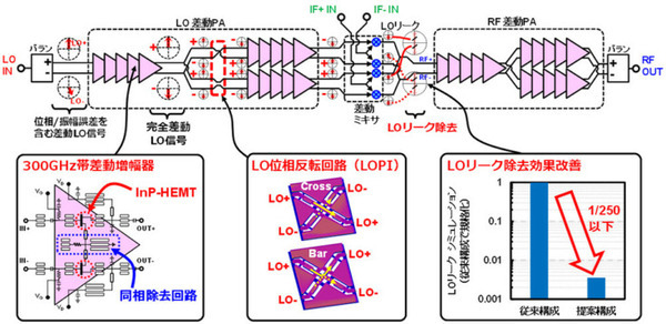 FEの集積化を行うには、ミキサで生じる不要波であるLOリークが大きな課題となる。LOリークは、ミキサと一緒に集積される他の回路動作に悪影響を及ぼし、FEが伝送する信号の品質を劣化させるため、除去する必要がある。バラック形態では、LOリークを除去可能なフィルタを準備することによりこの問題を解決できるが、1つの集積回路内部でLOリークを除去することがサブテラヘルツ帯では困難だった。そこで、今回、サブテラヘルツ帯においても、集積回路内部でLOリークを除去可能な差動構成のFEを検討した。